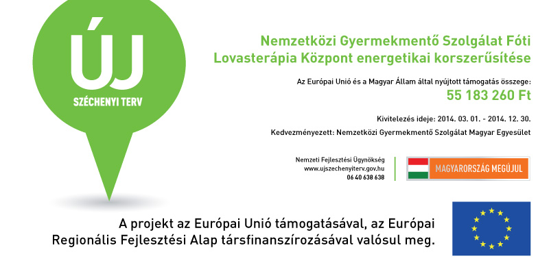 | 2014. 03. 18 | infonaplo. blogstop.hu | Az Új Széchenyi Terv támogatásával végzi el a Nemzetközi Gyermekmentő Szolgálat fóti Lovasterápiás és Oktató Központja három épületének energetikai korszerűsítését |